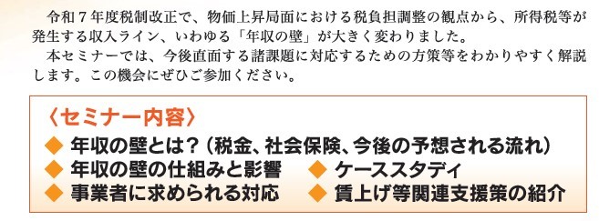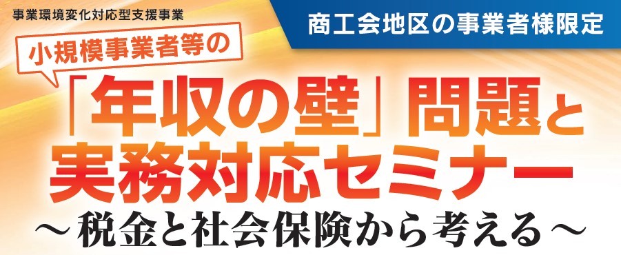「年収の壁」に関する所得税や社会保険の変更点、事業者に求められる対応についてのセミナーを県下20商工会にて順次開催します。参加費は無料!ぜひご参加ください。