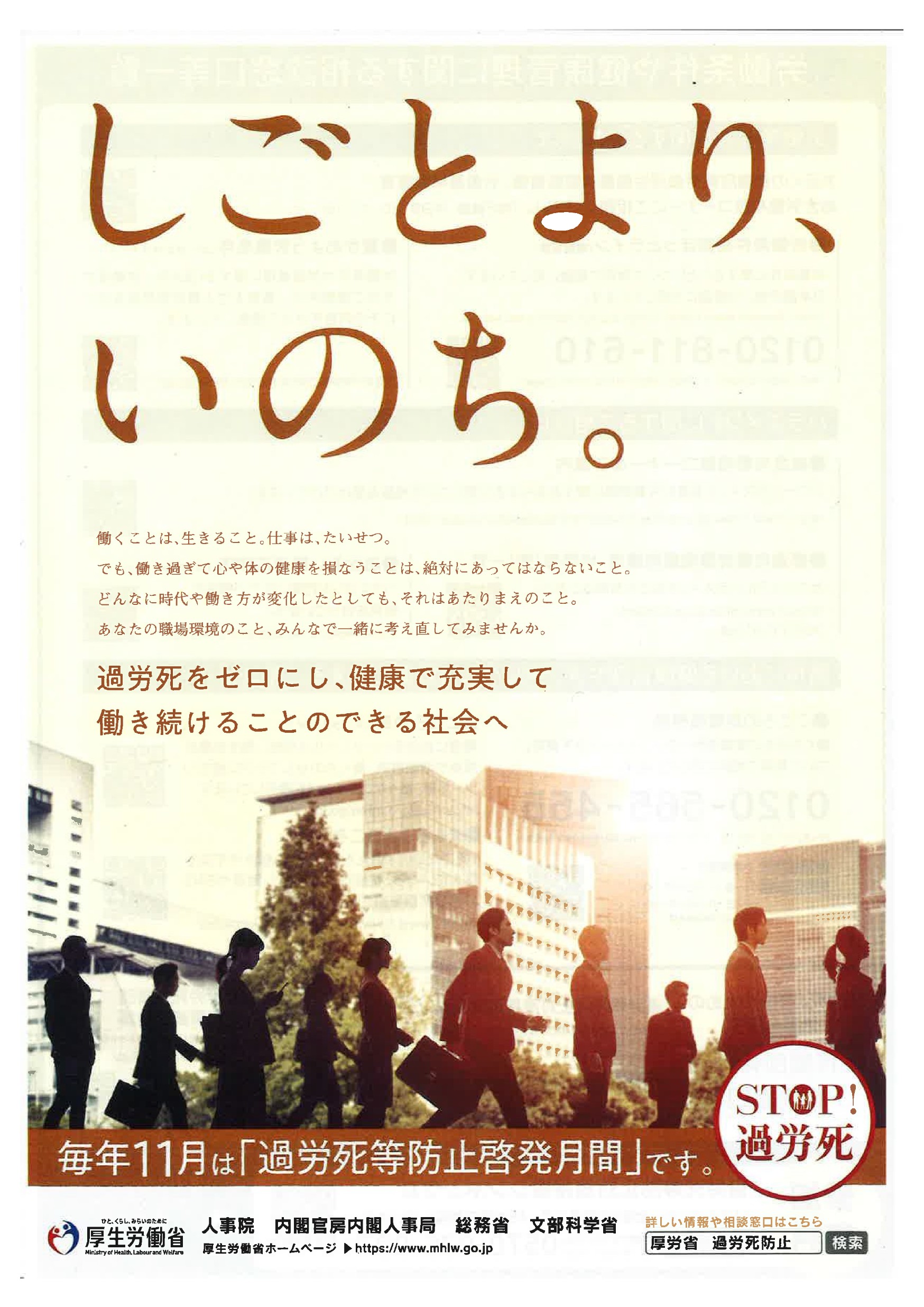 過労死等防止対策推進法では、国民の間に広く過労死等を防止することの重要性について自覚を促し、これに対する国民の関心と理解を深めるため、毎年11月を「過労死等防止啓発月間」と定めております。